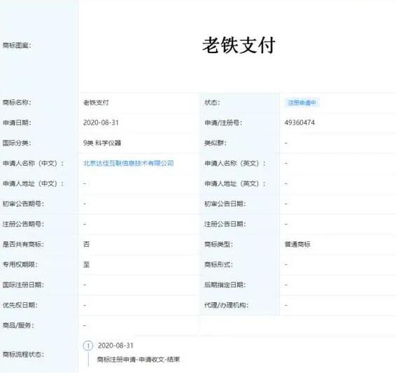 近日,北京達(dá)佳互聯(lián)信息技術(shù)有限公司申請(qǐng)注冊(cè)“老鐵支付”,“老鐵該付錢了”將走進(jìn)現(xiàn)實(shí)。企查查工商信息顯示,北京達(dá)佳互聯(lián)信息技術(shù)有限公司成立于2014年7月2日,公司法定代表人為楊遠(yuǎn)熙,關(guān)聯(lián)公司包含北京華藝匯龍網(wǎng)絡(luò)科技有限公司、北京一笑科技發(fā)展有限公司等。