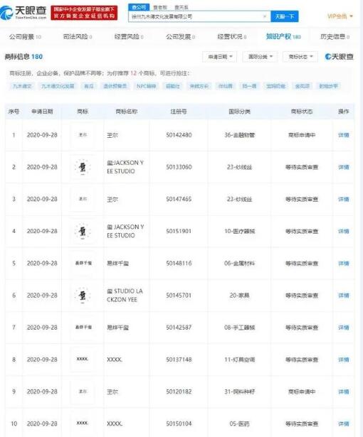 天眼查App顯示,近日,徐州九木德文化發(fā)展有限公司申請注冊多個“易烊千璽”、“玊爾”、“璽 JACKSON YEE STUDIO”商標,國際分類涉及金融物管、醫(yī)療器械、食品、啤酒飲料等,商標狀態(tài)為商標申請中和等待實質審查。