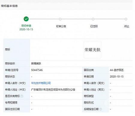 12月2日,據天眼查最新消息稱,10月15日,華為技術有限公司申請注冊“榮耀美膚”商標。頁面顯示,“榮耀美膚”商標申請注冊號為50447546,國際分類為醫療園藝,商標狀態為“商標申請中”。其它詳情暫時未知。