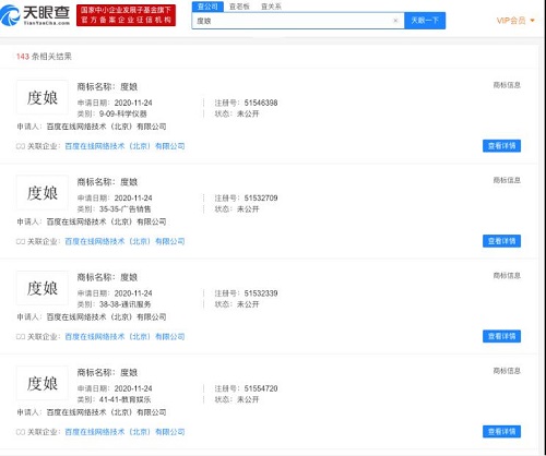 近日,百度在線網絡技術(北京)有限公司新增多條“度娘”商標信息,國際分類包含廣告銷售、通訊服務、教育娛樂、科學儀器等,申請日期為2020年11月24日。