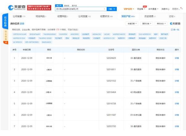 天眼查App顯示,近日,蘇州思必馳信息科技有限公司新增多條商標信息,包括“小蔥智能”、“小蔥AI”、“你好小蔥”等,涉及的國際分類包含通訊服務、廣告銷售、網站服務等,目前商標狀態為“商標申請中”。
