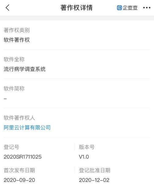 企查查APP顯示,阿里云計(jì)算有限公司“流行病學(xué)調(diào)查系統(tǒng)”軟件著作權(quán)于12月2日被登記批準(zhǔn),該軟件開發(fā)完成時(shí)間為今年9月。值得一提的是,今年4月,該公司獲醫(yī)療器械經(jīng)營(yíng)企業(yè)(備案),證書編號(hào)為浙杭食藥監(jiān)械經(jīng)營(yíng)備20203555。