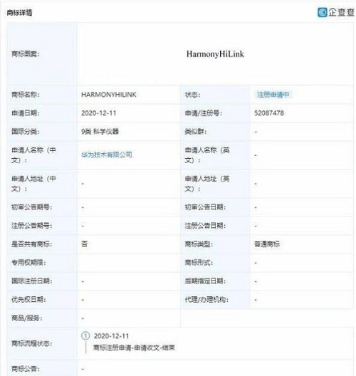 企查查APP顯示,近日,華為技術有限公司新增多條鴻蒙系統相關商標申請信息,商標名稱包括“HARMONYHILINK”、“HongmengConnect”、“HarmonyConnect”、“HongmengHiLink”等,國際分類均涉及科學儀器,商標狀態均為“注冊申請中”。