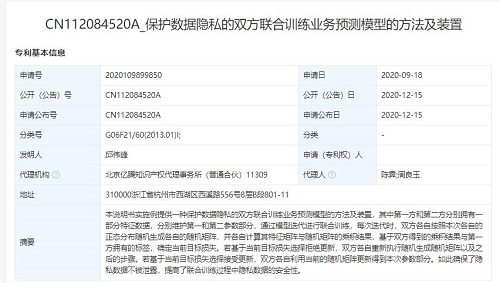 近日,支付寶(杭州)信息技術有限公司公開多條“隱私保護”的專利。包括“保護數據隱私的雙方聯合訓練業務預測模型的方法及裝置”、“基于差分隱私保護的內容風險小程序識別方法及裝置”等,上述專利申請日期為2020年9月,申請公布日為2020年12月15日。