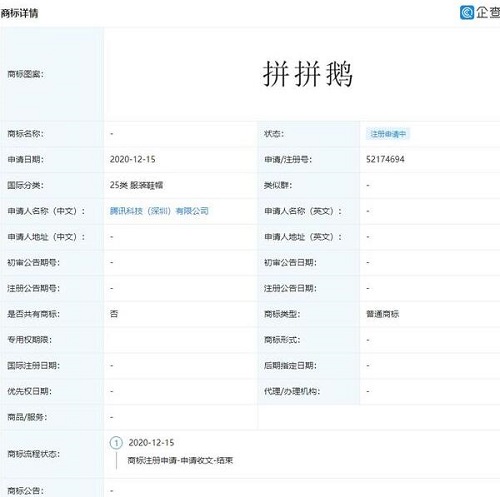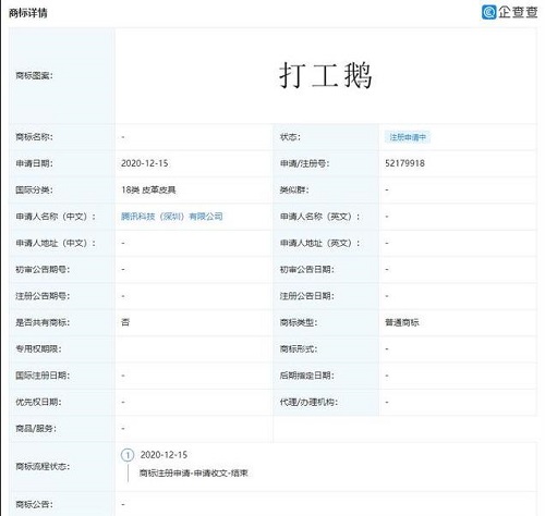 騰訊科技(深圳)有限公司于近日新增“打工鵝”、“拼拼鵝”等商標信息,商標涉及的國際分類包含家具、辦公用品、廣告銷售、科學儀器等,目前商標狀態為商標申請中。今年“打工人”成為了即社畜、打工仔之后,展示當代年輕人在社會奮斗、努力工作的新詞匯。“打工人打工魂打工都是人上人”更是成為當代年輕人的口頭禪。