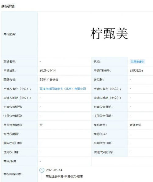 1月14日,百度在線網絡技術(北京)有限公司申請“檸甄美”等相關商標,國際分類包含44類醫療園藝、45類社會法律、35類廣告銷售等,商標狀態為“注冊申請中”。