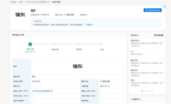 近日,北京京東世紀貿易有限公司新增一條“強東”商標申請信息,國際分類“建筑修理”,商標狀態為“商標申請中”,申請日期為2020年11月9日。