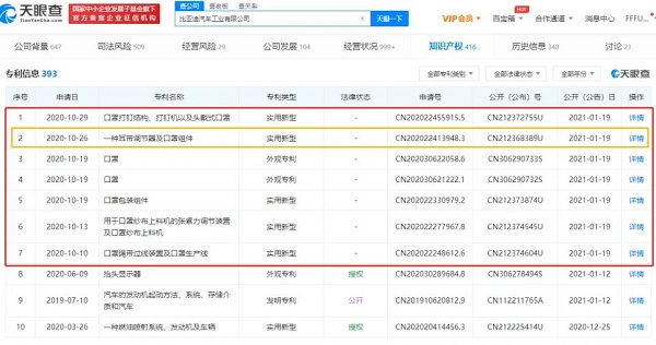 比亞迪汽車工業有限公司1月19日發布7個與口罩相關的專利申請,包括兩個口罩外觀專利,一個口罩打釘結構、打釘機以及頭戴式口罩專利,一個耳帶調節器及口罩組件實用新型專利,一個口罩包裝組件專利,一個用于口罩紗布上料機的張緊力調節裝置及口罩紗布上料機的專利,一個口罩繩帶過線裝置及口罩生產線專利。