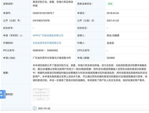 近日,OPPO廣東移動通信有限公司公開一種“唇語識別方法、裝置、存儲介質及移動終端”發(fā)明專利,公開號為CN108537207B,專利摘要顯示,本申請實施例公開了唇語識別方法、裝置、存儲介質及移動終端。該方法包括:當檢測到唇語識別事件被觸發(fā)時,通過3D攝像頭獲取當前用戶的至少一幀3D唇部圖像;將所述3D唇部圖像輸入至預先訓練的唇語識別模型中。本申請實施例通過采用上述技術方案,可以通過預先構建的唇語識別模型對3D唇部圖像進行簡單、快速的唇語識別,并進一步提高了唇語識別的準確性,有效提高了用戶的人機交互體驗,較好地滿足用戶需求。