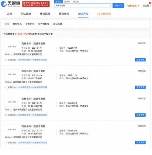 1月14日,北京嘀嘀無(wú)限科技發(fā)展有限公司申請(qǐng)注冊(cè)“滴滴千里眼”商標(biāo),申請(qǐng)日期為2021年1月14日,國(guó)際商標(biāo)注冊(cè)分類為通訊服務(wù)、網(wǎng)站服務(wù)、廣告銷售、運(yùn)輸貯藏,目前商標(biāo)狀態(tài)顯示為“商標(biāo)申請(qǐng)中”。