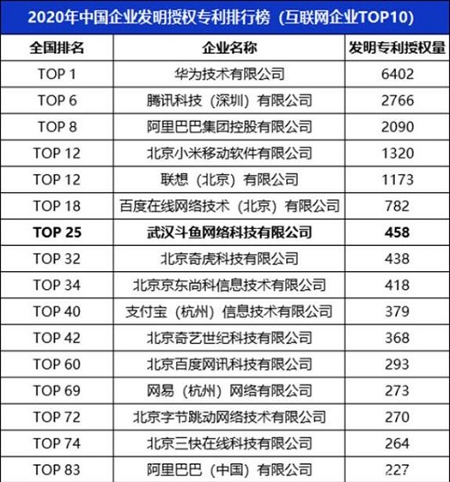 其中,游戲直播平臺斗魚,發明授權專利申請量位居中國互聯網行業第七,是直播行業唯一上榜平臺。