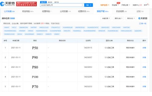 3月11日,華為技術有限公司申請注冊“P50”“P60”“P70”“P80”“P90”“P100”等商標,國際商標分類涉科學儀器、運輸工具,商標狀態為“商標申請中”。