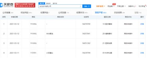 除“小藝建議”外,華為技術有限公司還申請了“華為智選”相關商標,國際分類為醫療器械、健身器材等,商標狀態均為“商標申請中”。