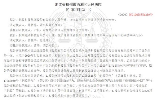 近日,螞蟻科技集團股份有限公司與杭州融動科技有限公司侵害商標權糾紛一審民事判決書公布。原告為螞蟻科技集團股份有限公司,被告為網貸天下關聯公司杭州融動科技有限公司。