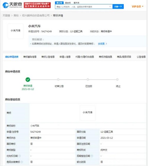據天眼查顯示,“小米汽車”商標已被申請注冊,國際分類為廣告銷售、運輸工具,申請人為紹興冀祥紡織品有限公司,申請日期為2021年3月,目前商標狀態為“商標申請中”。