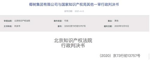 據北京法院審判信息網消息,4月5日,椰樹集團有限公司與國家知識產權局其他一審行政判決書公布,原告為椰樹集團有限公司,被告為國家知識產權局,案由為商標申請駁回復審行政糾紛。案號為(2020)京73行初13757號,審理法院為北京知識產權法院。