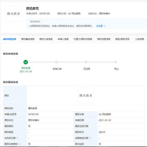 近日,騰訊科技(深圳)有限公司申請注冊“騰訊教育”商標,國際分類包含教育娛樂、網站服務、科學儀器等,目前商標狀態均為商標申請中。