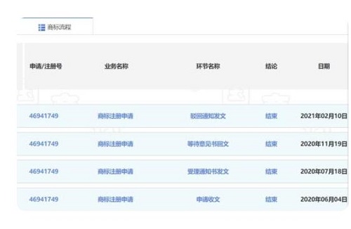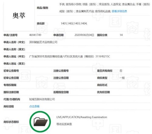 為了進(jìn)一步了解、核實(shí)情況,中國(guó)市場(chǎng)監(jiān)管報(bào)記者登錄中國(guó)商標(biāo)網(wǎng),申請(qǐng)人一欄輸入“深圳賦能藝術(shù)品有限公司”字樣,點(diǎn)擊第46941749號(hào)“奧萃”商標(biāo),隨即打開(kāi)的頁(yè)面顯示該商標(biāo)申請(qǐng)日期為2020年6月4日,使用商品為第14類(lèi);商標(biāo)流程頁(yè)面顯示該商標(biāo)注冊(cè)申請(qǐng)于2021年2月10日被駁回。