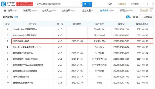 近日,北京百度網(wǎng)訊科技有限公司新增一條軟件著作權(quán)登記信息,軟件全稱為“醫(yī)療語音錄入系統(tǒng)”,簡稱“語音電子病歷”,登記批準(zhǔn)日期為2021年3月30日,當(dāng)前版本號為V1.0。