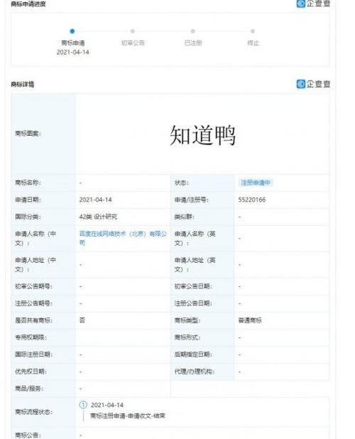 近日,百度在線網絡技術(北京)有限公司新增“知道鴨”商標申請信息,國際分類為設計研究,商標狀態為“注冊申請中”。