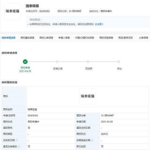 近日,瑞幸咖啡(中國)有限公司申請注冊“瑞幸吸貓”“瑞幸貓咪”商標,國際分類為飼料種籽、方便食品、餐飲住宿等,目前商標狀態均為商標申請中。