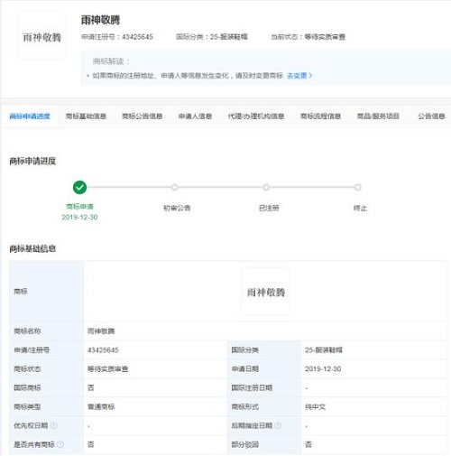 “雨神敬騰”商標已被申請注冊,申請人為南京崇榮電子商務有限公司,國際分類為服裝帽,當前商標狀態為“等待實質審查”。