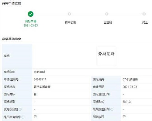 此外,“勞斯萊斯”相關商標已被多個公司及自然人申請注冊,國際分類涉及機械設備、健身器材等,當前商標狀態多為“等待實質審查”。