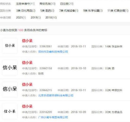信小呆目前已被多家公司、個人注冊商標,其中2018年注冊數量高達98家,注冊公司地址遍布全國,目前已有29項商標被成功注冊。商標類別包括服裝帽、酒類、餐飲住宿、健身器材等。