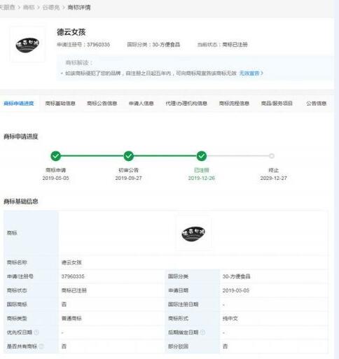 “德云女孩”商標(biāo)已被多家公司及自然人申請(qǐng)注冊(cè),申請(qǐng)人包括杭州臉枕科技有限公司、谷德亮等,國際分類涉及樂器、方便食品、飼料種籽等,商標(biāo)狀態(tài)多為“商標(biāo)已注冊(cè)”“等待實(shí)質(zhì)審查”。