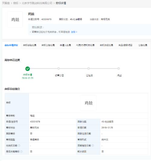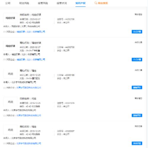 “雞娃”商標(biāo)已被多家公司申請(qǐng)注冊(cè),國際分類涉及社會(huì)服務(wù)、教育娛樂、辦公用品等。申請(qǐng)人包括北京字節(jié)跳動(dòng)科技有限公司、成都大贊宏圖科技有限公司、珠海我愛生活科技有限公司等。目前商標(biāo)狀態(tài)為等待實(shí)質(zhì)審查、無效等。
