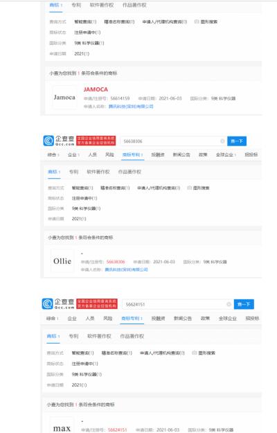 6月3日,騰訊科技(深圳)有限公司申請注冊“Ollie”、“JAMOCA”、“Max”商標,國際分類涉9類科學儀器。