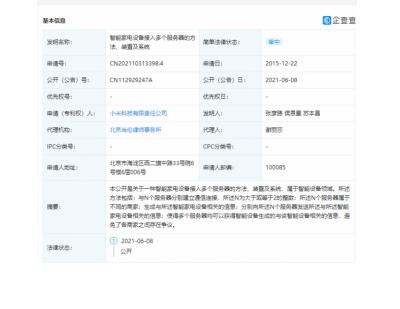 6月8日,小米科技有限責任公司公開“智能家電設備接入多個服務器的方法、裝置及系統”發明專利,公開號為CN112929247A。