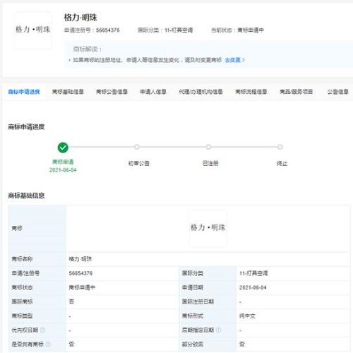 近日,珠海格力電器股份有限公司申請注冊“格力·明珠”商標,國際分類為燈具空調,商標狀態為申請中。目前該公司已完成多個格力明珠商標的注冊,國際分類涵蓋網站服務、珠寶鐘表、科學儀器等。