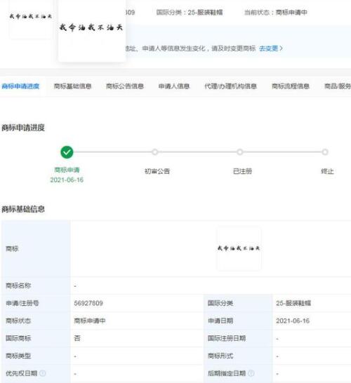 6月16日,歐某申請注冊“我命油我不油天”商標,注冊號為56927809,國際分類為服裝鞋帽,商標狀態為“商標申請中”。