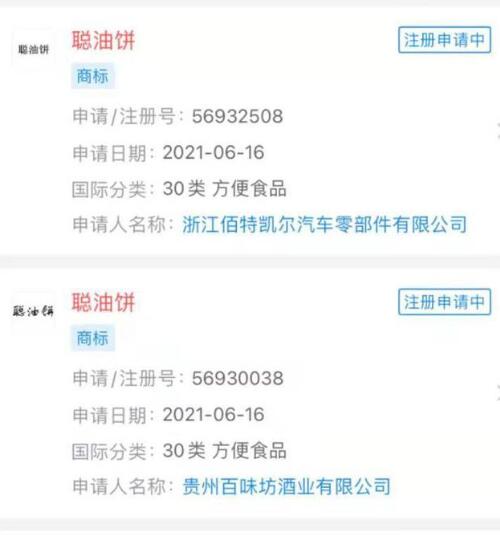 “聰油餅”被多家公司申請(qǐng)注冊(cè)商標(biāo),國(guó)際分類涉及食品、廣告銷售、餐飲住宿等,商標(biāo)狀態(tài)為注冊(cè)申請(qǐng)中。