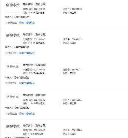 河南廣播電視臺申請注冊多個“洛神水賦”商標(biāo),國際分類涉及餐飲住宿、方便食品、通訊服務(wù)等,當(dāng)前商標(biāo)狀態(tài)為商標(biāo)申請中。