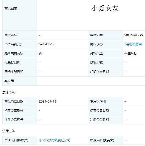 近日,小米科技有限責任公司申請注冊小愛女友商標,國際分類涉9類科學儀器,目前商標狀態為注冊申請中。