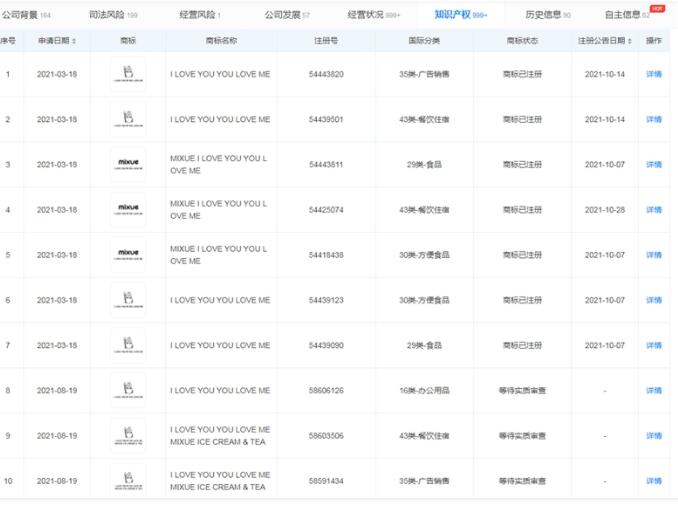 近期,蜜雪冰城股份有限公司申請的多個“I LOVE YOU YOU LOVE ME”商標已注冊成功,國際分類涉及廣告銷售、方便食品餐飲住宿等。