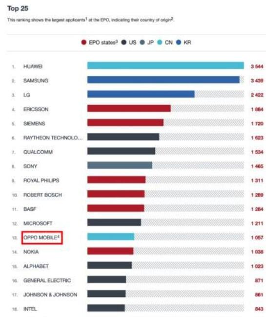 近日據外媒報,歐洲專利局(EPO)正式公布了《2021 年度專利報告》,統計了全球科技廠商在過去的一年內申請的專利數目。Top 25 中共出現華為、OPPO、中興、百度四家國企,其中 OPPO 以 1057 件專利申請次數排名總榜第 13 位。