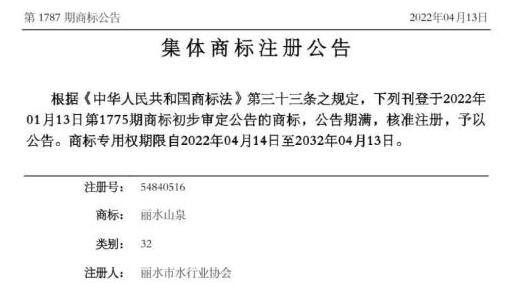 國(guó)家商標(biāo)局發(fā)布《集體商標(biāo)注冊(cè)公告》,“麗水山泉”集體商標(biāo)結(jié)束3個(gè)月的初審公告期,正式核準(zhǔn)注冊(cè),這是麗水“山字系”品牌建設(shè)之路上的又一個(gè)里程碑!