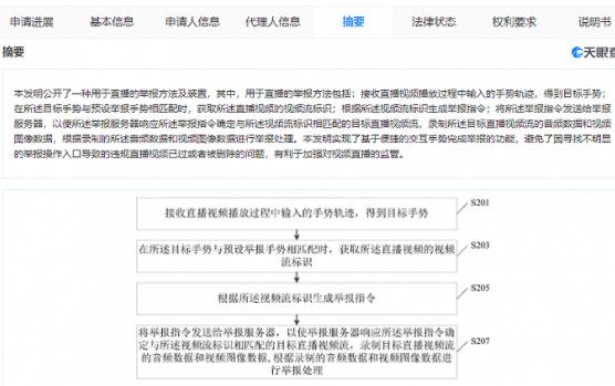 專利摘要顯示,舉報方法包括:接收直播視頻播放過程中輸入的手勢軌跡,得到目標手勢;在目標手勢與預設舉報手勢相匹配時,獲取直播視頻的視頻流標識,并生成舉報指令;將指令發送給服務器,服務器響應后,確定目標直播視頻流并錄制音視頻數據,進行舉報處理。本發明可實現基于交互手勢完成舉報的功能,避免因尋找不明顯的舉報操作入口導致的違規直播視頻已過或者被刪除的問題,有利于加強對視頻直播的監管。