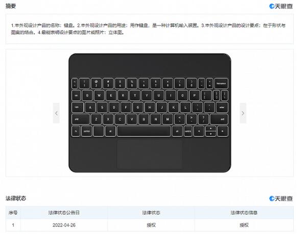 專利摘要顯示,本外觀設計產品用作鍵盤,是一種計算機輸入裝置,設計要點在于形狀與圖案的結合。