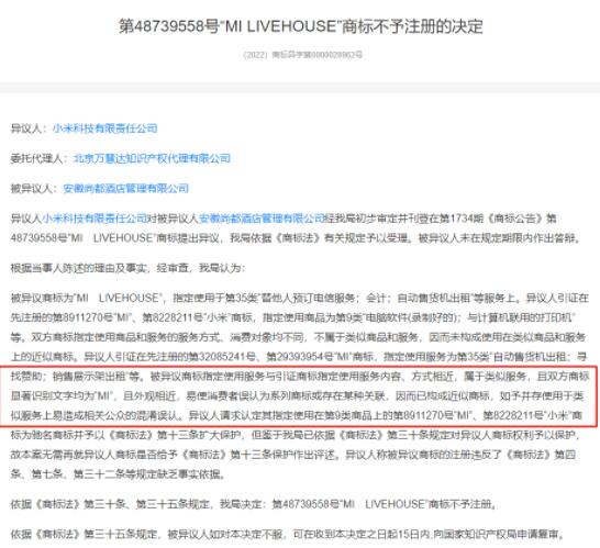 國家知識產權局審查認為,被異議商標指定使用服務與異議人引證商標“MI”屬于類似服務,且雙方商標外觀相近,顯著識別文字均為“MI”,構成近似商標,如予并存使用于類似服務上易造成相關公眾的混淆誤認。依據《商標法》規(guī)定,決定對第48739558號“MI LIVEHOUSE”商標不予注冊。