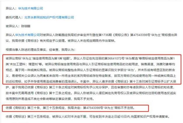 文書詳情顯示,華為技術(shù)有限公司對(duì)陳某申請(qǐng)的“華為土”商標(biāo)提出異議。商標(biāo)局審查認(rèn)為,被異議商標(biāo)指定使用商品為第1類“硅酮”,與異議人引證在先注冊(cè)的“華為智選”等商標(biāo)核定使用的“未加工塑料;增塑劑”等屬于同一種或類似商品,被異議商標(biāo)完整包含異議人引證商標(biāo)的顯著識(shí)別文字部分“華為”,并未形成有明顯區(qū)別的新含義,如予并存使用易使消費(fèi)者誤認(rèn)。因此,依據(jù)商標(biāo)法規(guī)定,第47543398號(hào)“華為土”商標(biāo)不予注冊(cè)。