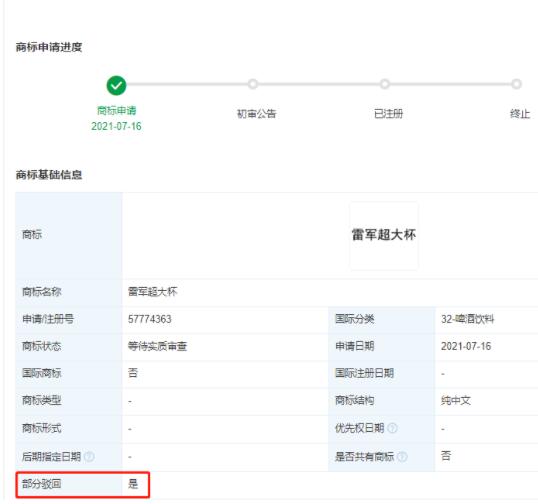 天眼查App顯示,近期,小米科技有限責任公司申請的多個“雷軍超大杯”商標流程變更為“駁回通知發文”,這些商標均申請于2021年7月,國際分類含廣告銷售、啤酒飲料、食品等。不過,該公司申請的多個“XIAOMI XL”“XL CUP”“XIAOMI XL CUP”商標狀態已變更為“初審公告”。