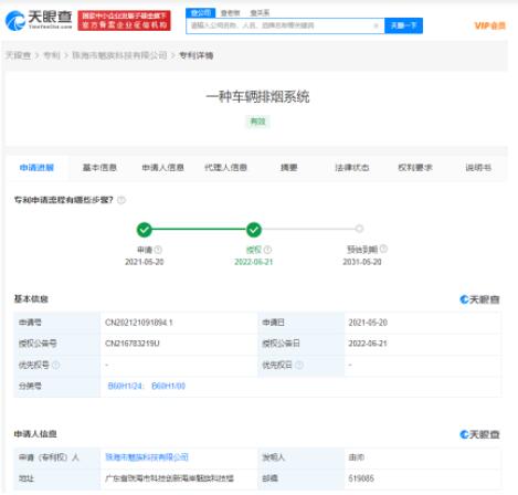 近日,珠海市魅族科技有限公司申請的“一種車輛排煙系統”專利獲得授權。