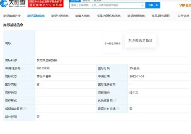 據天眼查消息,東方優選(北京)科技有限公司近日申請注冊“黑甄豬”“東方甄選黑甄豬”商標,國際分類為食品、方便食品,當前商標狀態為申請中。