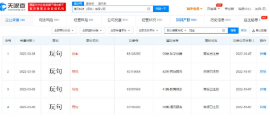 天眼查App顯示,騰訊科技(深圳)有限公司于今年3月申請注冊4枚“玩句”商標,國際分類為科學儀器、教育娛樂、通訊服務、網站服務,這些商標于10月7日已注冊成功。