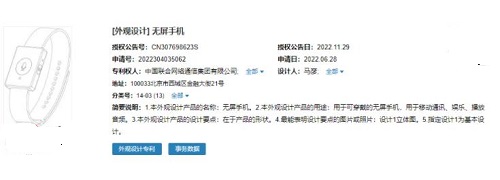 11 月 29 日消息,據(jù)國(guó)家知識(shí)產(chǎn)權(quán)局中國(guó)專利公布公告(授權(quán)公告號(hào):CN307698623S)顯示中國(guó)聯(lián)合網(wǎng)絡(luò)通信集團(tuán)有限公司申請(qǐng)的“無(wú)屏手機(jī)”外觀設(shè)計(jì)專利獲授權(quán)并公布。