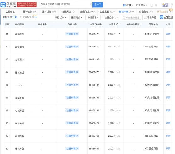 近日,以嶺藥業(yè)申請注冊多個“戀花清溫”“璉花清溫”“連花清文”“連花清韞”“連花清霏”等商標(biāo),國際分類包括醫(yī)療用品、啤酒飲料、方便食品,當(dāng)前商標(biāo)狀態(tài)均為注冊申請中。